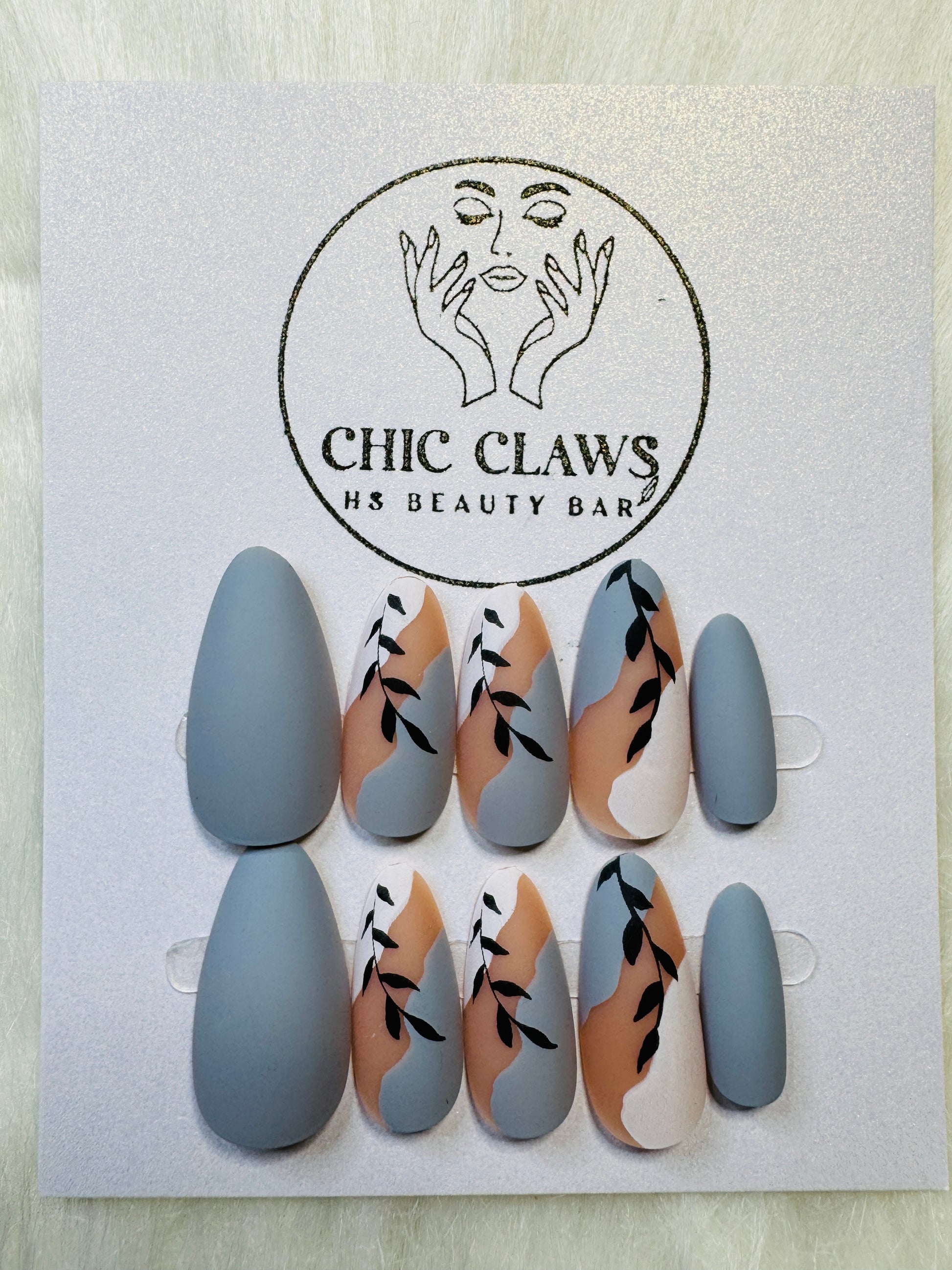 Matte grey, nude, and white swirls accented with leafy patterns. Artsy and modern.